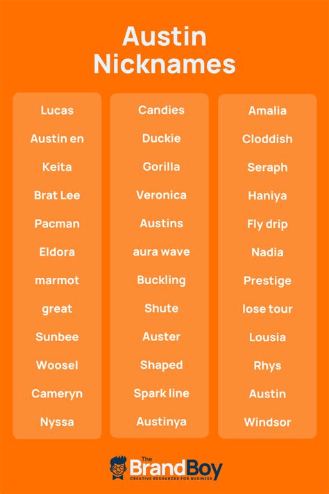 - Get creative: Think outside the box and come up with a nickname that is unique to Austin. It could be a play on words or a combination of his name and a word that describes him.